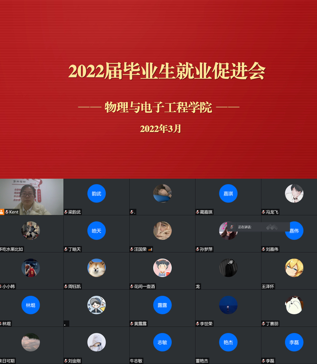 3月17日下午,物理与电子工程学院通过腾讯会议平台召开2022届毕业生就业促进会,学院党委副书记李玲、就业专职人员王伟夙,2018级全体本科生参加了会议。