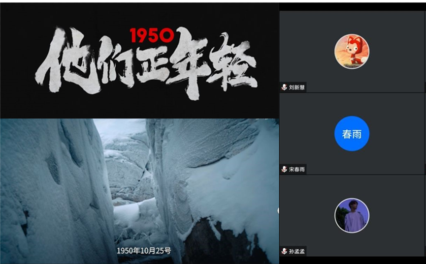 本次活动观看的影片是国内唯一公映的一部抗美援朝纪录片《1950他们正年轻》。该片以不同军种、不同时期参战老兵的回忆为线索,讲述来自于26位志愿军老兵的鲜活记忆,用打动人心的真实情节,将处于抗美援朝战争时期的感人故事用最质朴的方式表现。观影结束后,同学们纷纷分享了观影心得,文晓博同学说:“雄赳赳、气昂昂地跨过鸭绿江,志愿军们怀着保卫和平保家为国的决心走上了抗美援朝的朝鲜战场。他们为了祖国,为了人民,在朝鲜战场上奋勇拼杀,展现了我国志愿军战士不怕牺牲的大无畏牺牲精神。涌现了无数可歌可泣的感人事迹。那场战争虽然离我们远去了,但当年参加战斗的老一辈英雄还在,战争的记忆还在。我们要永远记住老一辈英雄,是他们用生命和热血代价赢得了我们今天的幸福生活。”