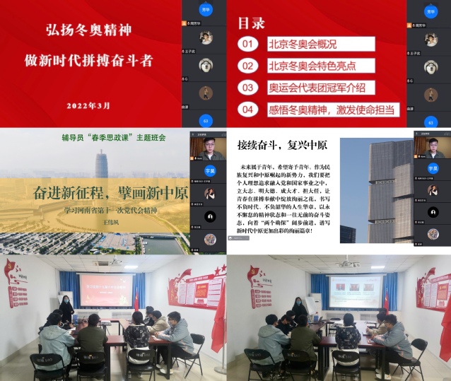 班会上,各辅导员以党的十九届六中全会精神,北京2022年冬奥会、冬残奥会、中国女足亚洲杯夺冠等体育盛会,河南省第十一次代表大会精神为主题,为学生开设了一堂精彩生动的思政课。通过深入领学党的十九届六中全会精神,清晰呈现了党百年奋斗的光辉历程,引导学生以史为鉴、开创未来进一步增强“四个意识”、 坚定“四个自信”、做到“两个维护”;通过分享北京2022年冬奥会等体育盛会的精彩时刻,激励学生树立敢于拼搏、永不服输的奋斗精神,有效贯彻习近平总书记关于体育的重要论述,教育学生在体育锻炼中享受乐趣、增强体质、健全人格、锤炼意志;通过讲述河南省第十次党代会以来各方面取得的成就和第十一次党代会的奋斗目标,分享近年来与学生息息相关的生活变化,引导学生牢记“两个确保”,学好专业知识,锤炼个人素养,将信心和决心凝集到推动现代化河南建设上来,为奋力谱写新时代中原更加出彩的绚丽篇章贡献力量。