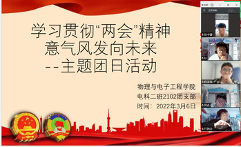 为深入学习贯彻全国“两会”精神,增强团员青年政治意识和责任担当。3月4日以来物理与电子工程学院组织各团支部开展“学习贯彻‘两会’精神,意气风发向未来”主题团日活动。