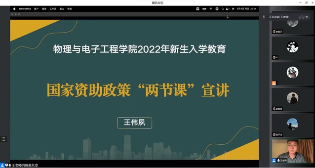 9月8日晚,物理与电子工程学院线上开展国家资助政策“两节课”宣讲暨诚信教育会,学院学生资助工作专职教师王伟夙及2022级全体学生参加了活动。