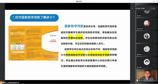 会上,王老师详细介绍了国家资助政策和我校资助体系概况,就高校助学贷款的申请流程和线上开展困难生认定的具体工作安排进行了详细解读,结合《教育部等六部门关于做好家庭经济困难学生认定工作的指导意见》文件精神,倡导同学们秉承诚信为本的原则,如实填报申请材料。随后,王老师结合国家网络安全宣传周校园日活动安排,进行了网络安全教育。通过讲解校园贷和电信诈骗的手段与危害,提醒同学们增强法律意识和信用意识,保护个人信息安全,在生活中养成勤俭节约的良好习惯,不盲目攀比,做到理性消费。