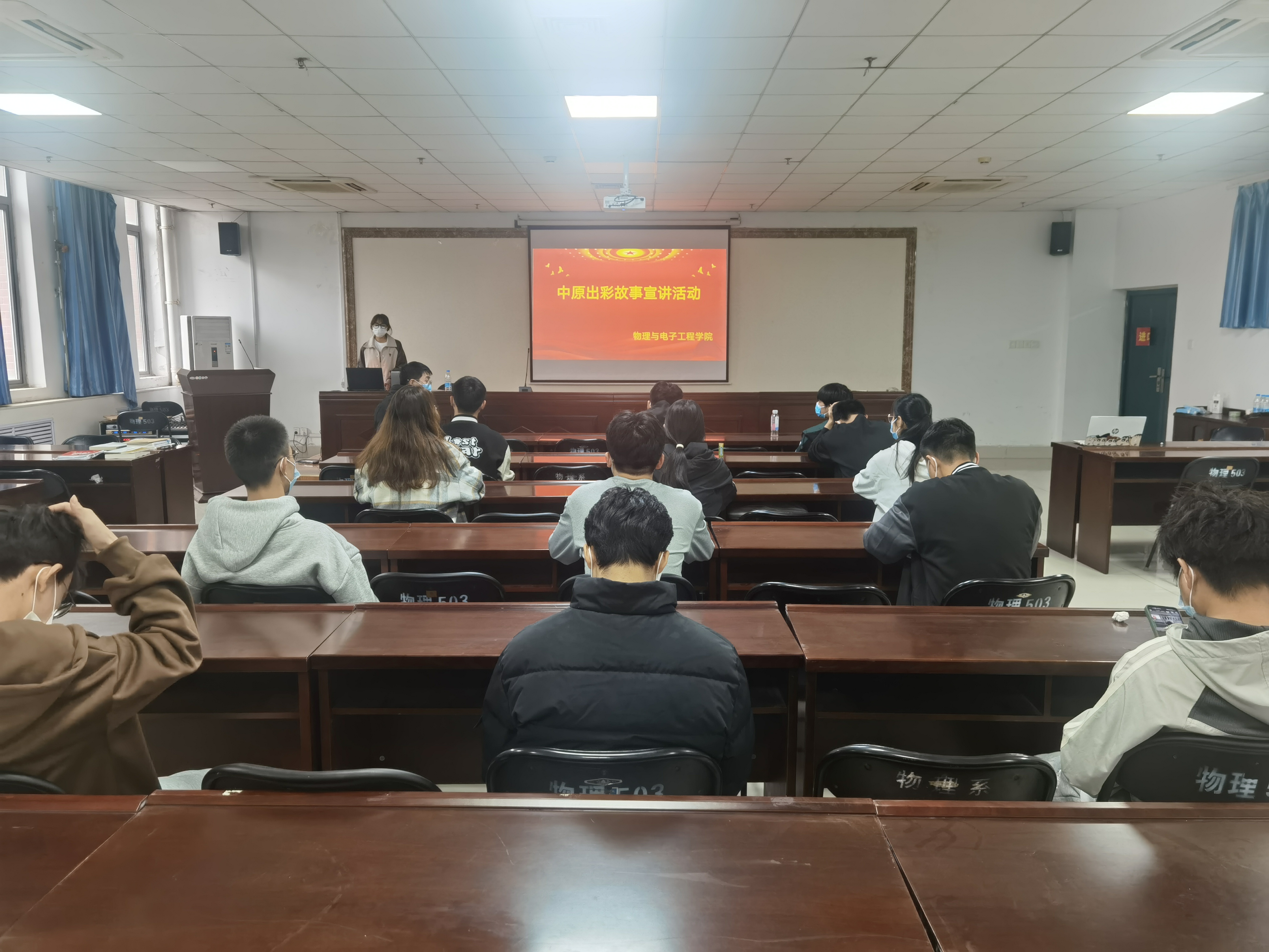 为深入学习贯彻近平总书记关于青年工作的重要讲话精神,2022年10月7日下午,物理与电子工程学院在四教楼503会议室采用线上线下结合的方式举办“喜迎二十大•中原出彩故事”宣讲比赛,2021级、2022级同学参加本次比赛。