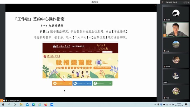 会上,李书记首先介绍了2022届毕业生的就业情况,分析了当前复杂严峻的就业形势,进而对2023届全体毕业生提出了几点希望:一要转变观念,调整就业心态。树立理性就业观念,深度挖掘自身优势,选择最适合自己的职业道路。二要明确目标,做好就业准备。希望同学们抓住秋季招聘的黄金时期,合理运用定点、定位、定向的“三定”原则,找准职业定位,充分做好简历制作、面试模拟等就业准备。三要坚定信心,积极主动就业。利用当下宝贵时间,查漏补缺,努力提高自身综合素养,用好学校、教师、家庭等多方位就业渠道,主动抓住就业机会。随后,王老师针对毕业生相关的就业创业政策、网上签约流程及填写的注意事项进行了详细说明,鼓励学生拓宽就业思路,尽早着手准备。