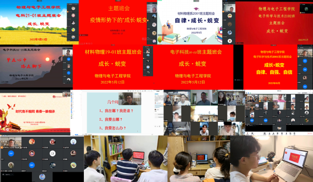 为更好地发挥班主任在思政工作中的协同育人作用,做好疫情防控期间的学生管理教育。近期,物理与电子工程学院组织全体班主任线上开展了“成长·蜕变”主题班会。