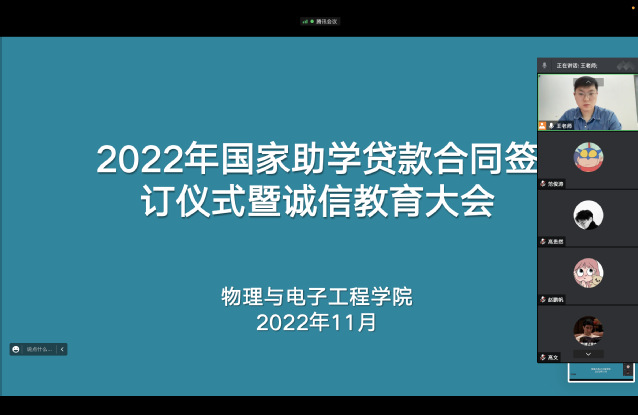 为顺利完成2022年国家助学贷款工作,增强学生的诚信感恩意识。物理与电子工程学院于11月10日线上召开了2022年国家助学贷款合同签订仪式暨诚信教育大会,学生资助工作专职辅导员王伟夙和申请2022年高校助学贷款的全体学生参加了会议。
