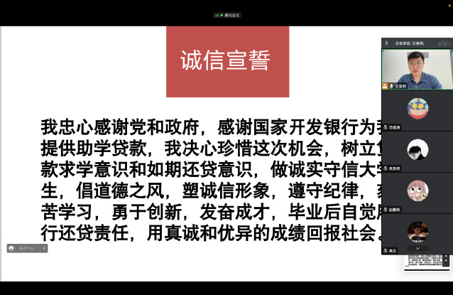 会上,王老师对国家助学贷款的政策和贷款发放、提前还款流程和未按时还款需承担的违约责任等方面进行详细解读,通过一系列征信案例强调了诚实守信的重要性,鼓励同学们珍惜获得国家助学贷款的机会,树立正确的消费观和良好的信用意识、感恩意识与社会责任感,按时履行贷款还款承诺,随后,王老师线上带来学生进行诚信宣誓。会后,学院按照疫情防控相关规定,线下逐一指导学生签订了助学贷款合同和承诺书。