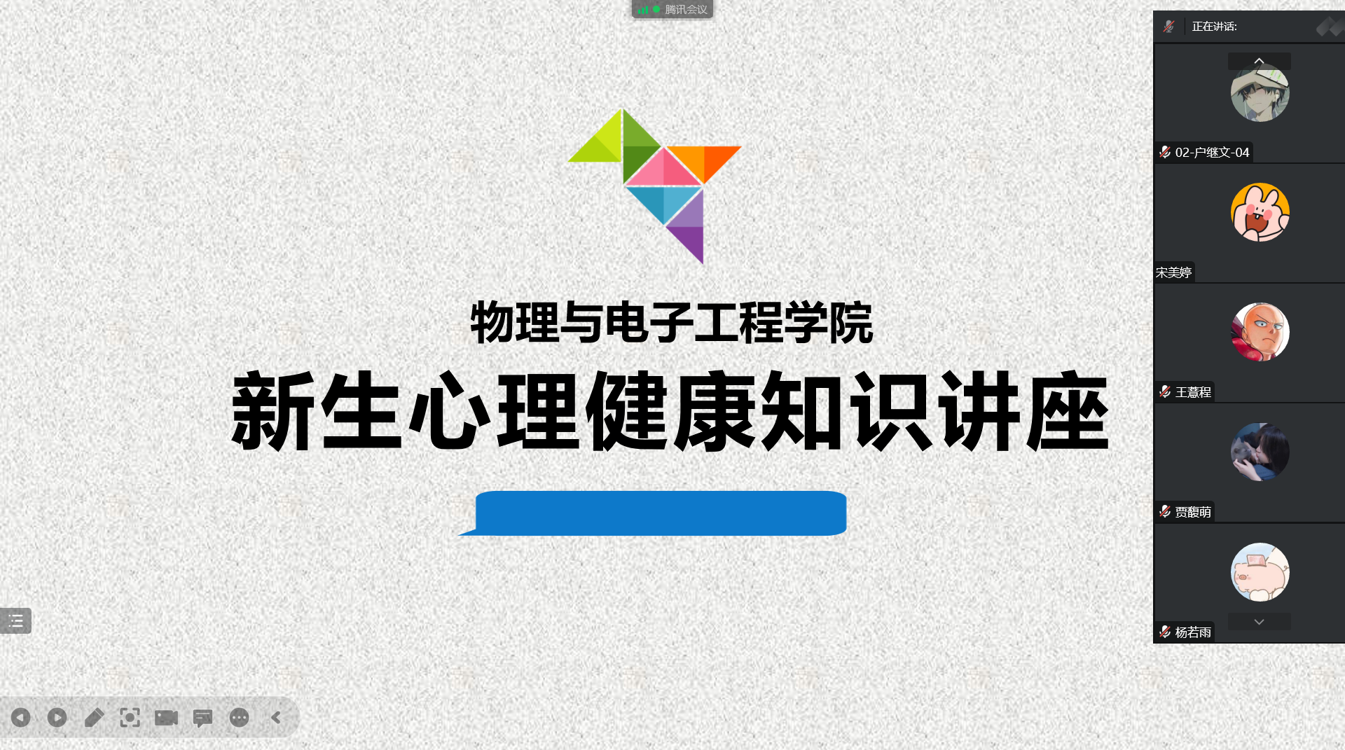 为帮助2022级新生更好地适应大学生活、完成角色转变,9月28日,物理与电子工程学院在线上举办了新生心理健康知识讲座,心理专职辅导员杨若雨老师和全体2022级新生参加了本次讲座。