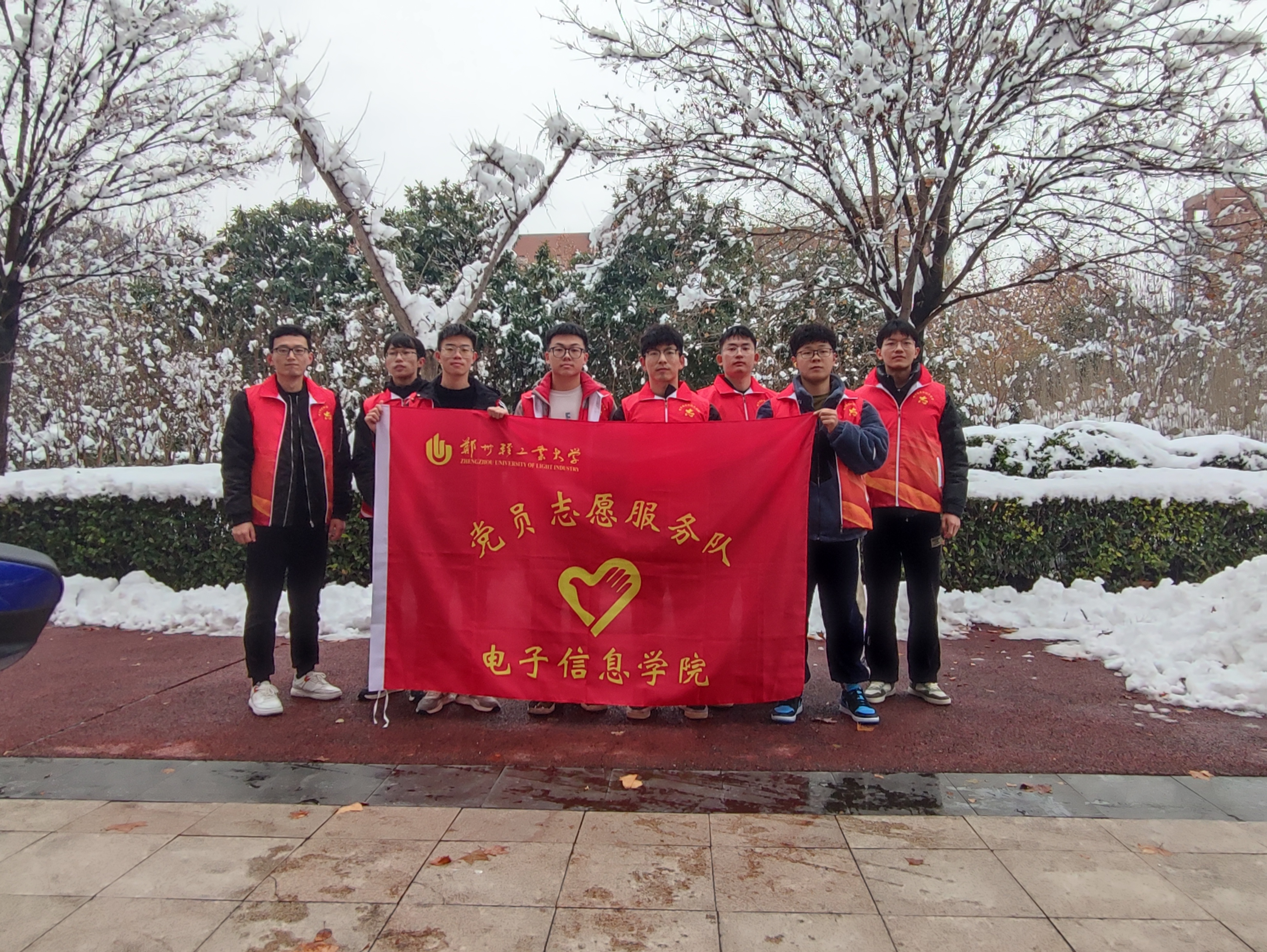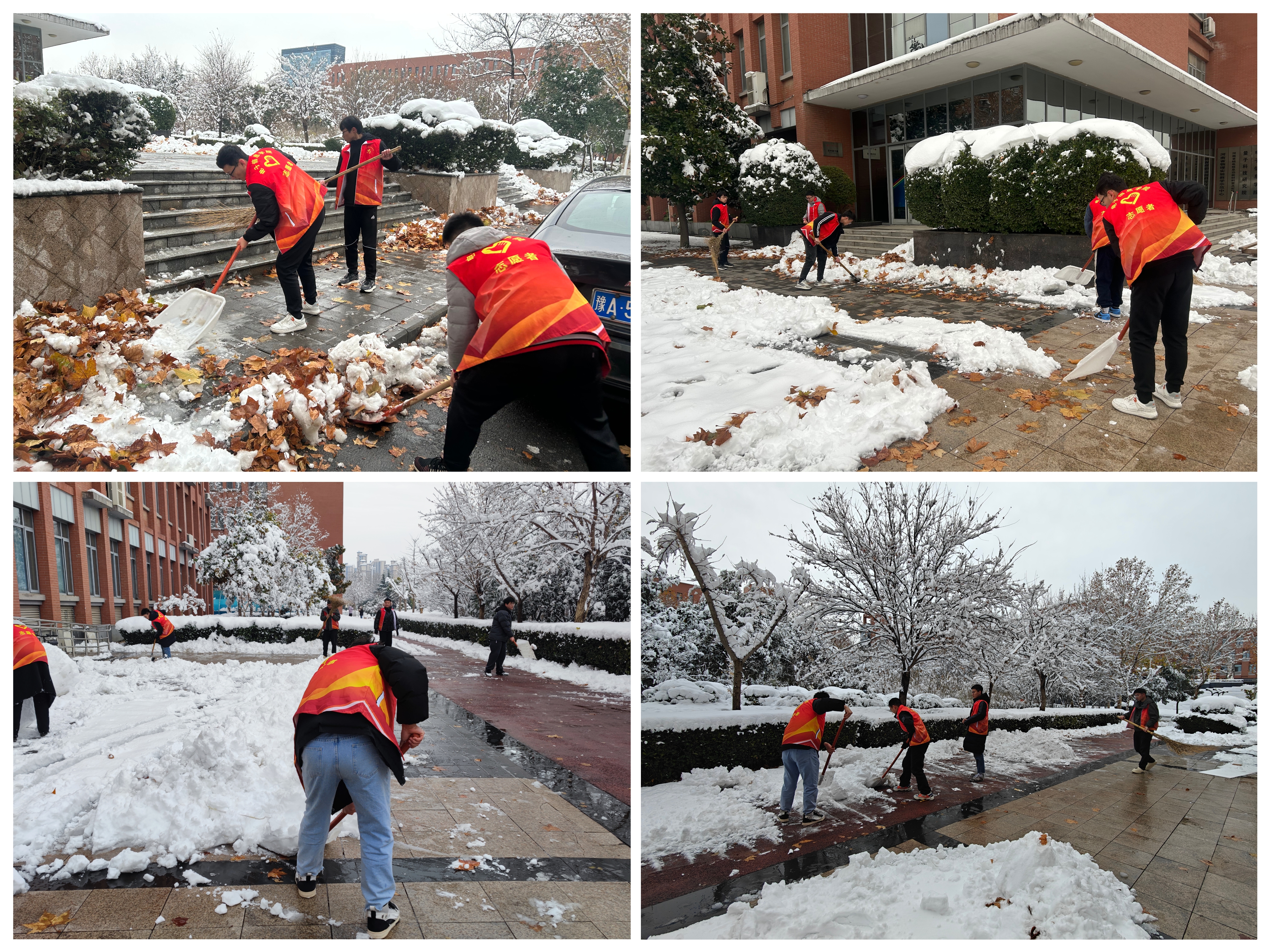 12月10日晚郑州迎来今年入冬第一场大雪,给校园道路通行带来了不便和隐患,为保证师生在校的出行安全,11日下午,电子信息学院组织学生党员开展义务扫雪活动,清除四教楼前广场及周围的积雪。