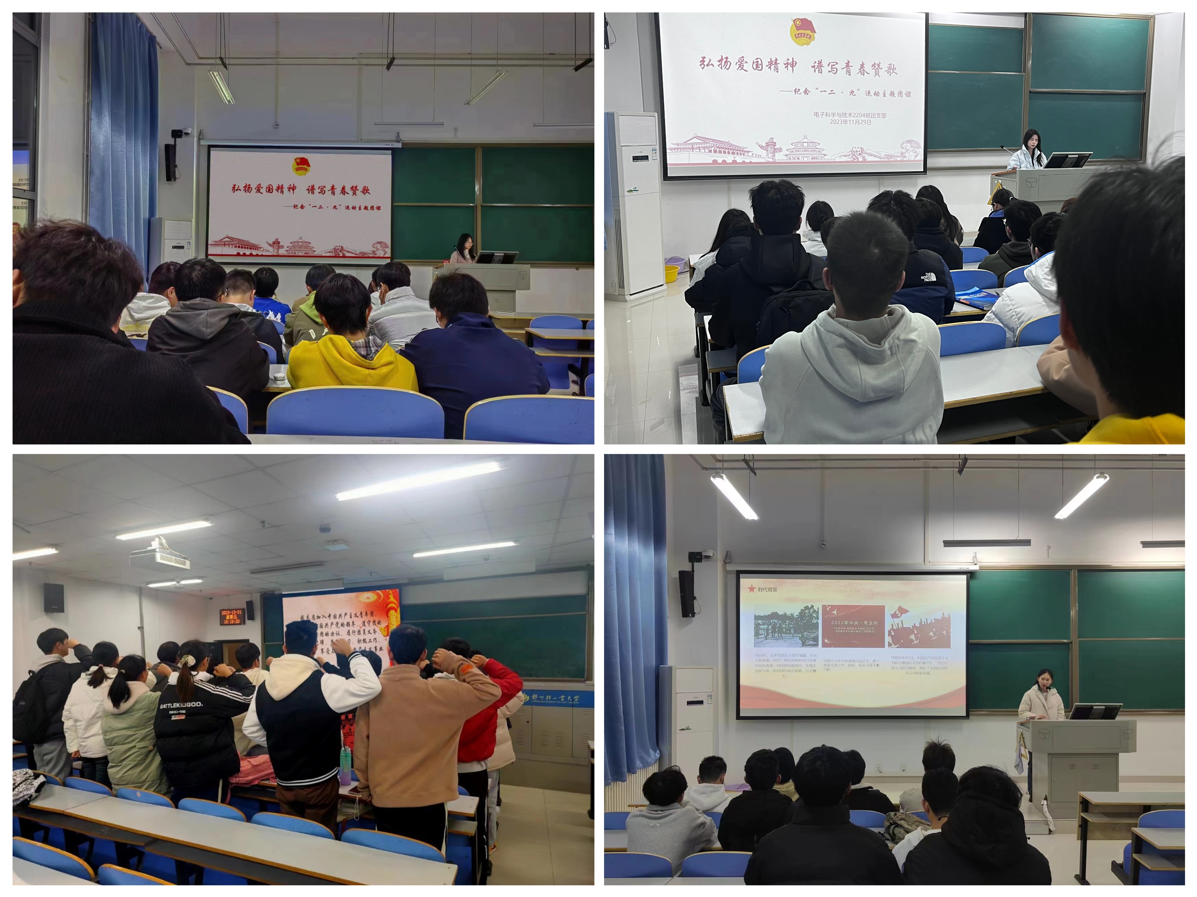各班团支部的团支书通过PPT展示和视频资料,详细的向同学们介绍了“一二•九”爱国运动的背景、过程以及意义,让同学们对“一二•九”爱国精神有了更深入的了解和更深刻的认识。其中,微电子科学与工程2302团支部通过观看红色电影《太行山上》,举行诗歌朗诵比赛等形式深入学习革命先辈们为国家与民族的尊严而战的伟大精神。通信工程2201团支部通过展示“一二•九”运动时期的史实照片、重温入团誓词等形式带领同学们学习了革命先辈们的奋勇拼搏精神,使同学们内心振奋、深受感动,深刻意识到作为新时代团员青年要牢记历史、不忘初心,坚定理想信念,矢志拼搏奋斗。
