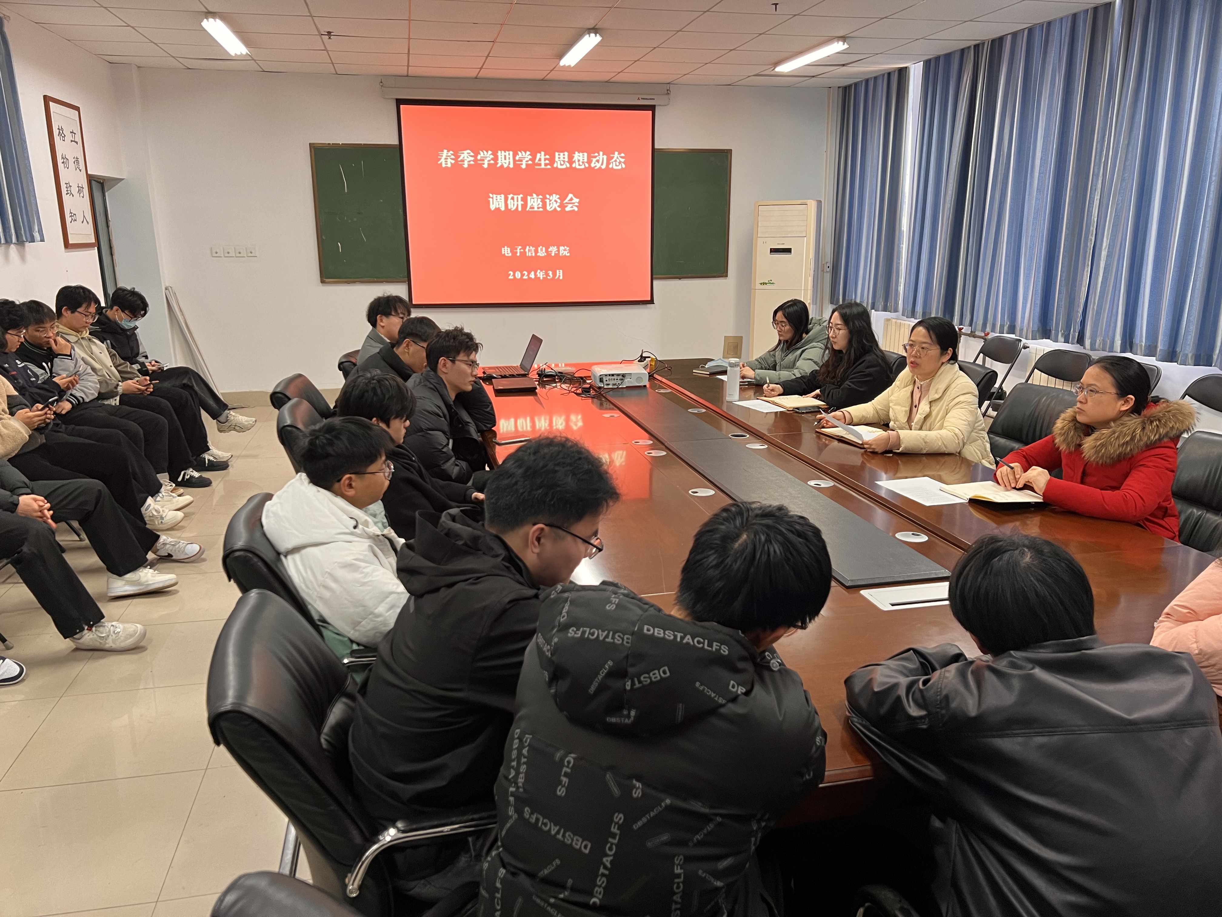 为全面掌握学生思想状况,有针对性地做好学生思想政治教育工作。3月4日中午,电子信息学院在四教楼510会议室召开学生思想动态调研座谈会。会议由学院党委副书记李玲主持,全体辅导员、各班班长及学生骨干参加了座谈会。