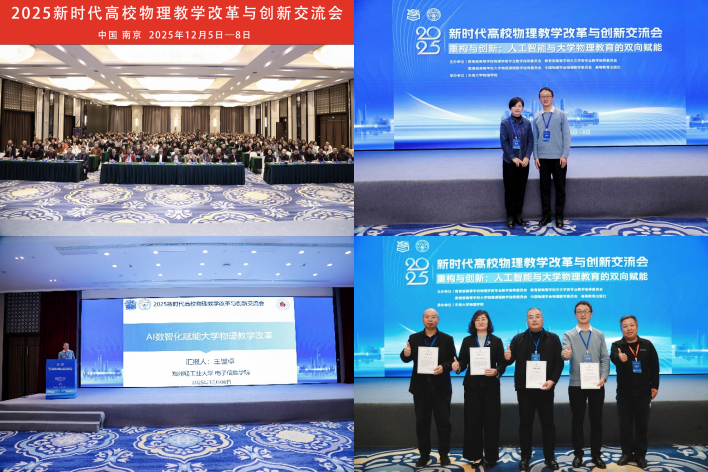 近日,“2025新时代高校物理教学改革与创新交流会”在江苏南京举行。会议以“重构与创新:人工智能与大学物理教育的双向赋能”为主题,由教育部高等学校物理学类、天文学类、大学物理课程教学指导委员会,联合中国物理学会物理教学委员会及高等教育出版社共同主办,吸引了全国近200所高校的450余名教师代表参会。电子信息学院组织大学物理教学部骨干教师参与研讨。