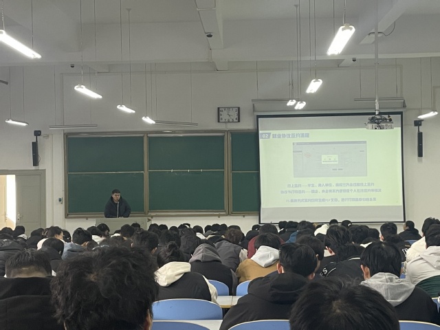 会上,王静立足当前就业形势,对就业机遇与挑战进行了深入解读。她强调,春季是求职的关键窗口期,毕业生应以时不我待的紧迫感主动出击,并就如何走好求职第一步提出三点明确要求:一要认清形势,明晰定位。要理性评估个人条件与市场需求,适时调整就业预期,在复杂环境中找准自身定位。二要主动作为,提升行动力。要深度挖掘自身优势,积极投身校园招聘活动,在求职实战中锻炼能力、锤炼心态,坚决克服“慢就业”“等靠要”等消极思想。三要精心准备,提高成功率。要充分利用春季双选会的宝贵机会,反复打磨个人简历,系统学习面试技巧,以最充分的准备迎接挑战,争取早日实现高质量就业。随后,王老师详细讲解了网上签约平台的操作流程,应征入伍、西部计划等政策,针对毕业生关切的“应届生”身份界定、求职陷阱防范等问题进行解答。