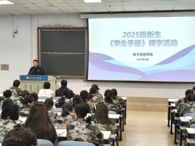 为帮助2025级新生尽快了解校规校纪,适应大学学习生活,9月17日,电子信息学院在东风校区开展了《郑州轻工业大学学生手册》专题学习活动。本次活动由新生辅导员郝昌老师主持,全体2025级新生参加。