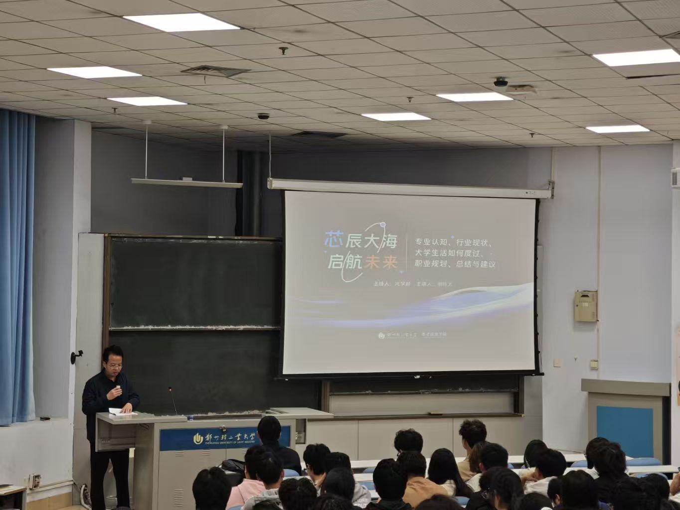 为助力2025级新生了解电子信息行业发展趋势,明确专业学习方向与职业规划,10月16日,电子信息学院在教三楼203教室举办“‘芯’辰大海·启航未来”新生入学企业专家讲座。本次讲座特邀郑州中科集成电路与系统应用研究院校企合作总监白杰、高级工程师胡修太担任主讲嘉宾,学院副院长冯学超、相关专业教师及2025级全体新生参加活动。